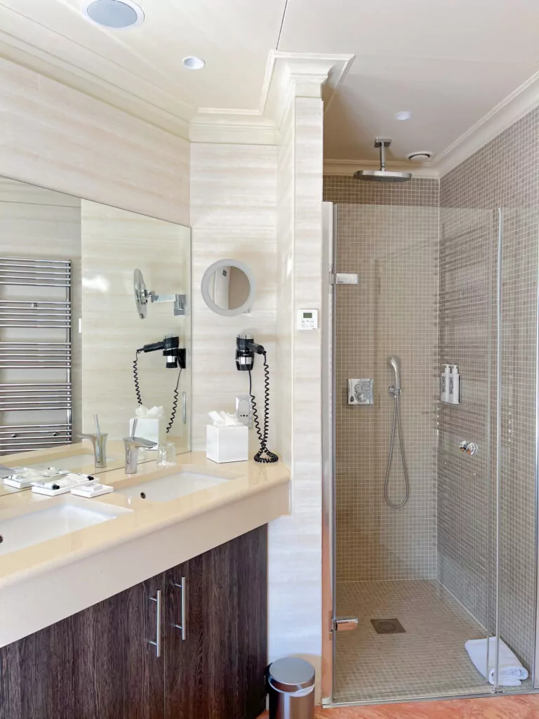 Without a doubt, it is the most spectacular accommodation of La Pérouse Hotel. Picture yourself in a 1,475 sq ft (137 sqm) private terrace with a jacuzzi facing the sea, sun loungers and a bistro dining set. In the marble bathroom, which also boasts a stunning sea view, are a freestanding soaking tub and separate rain shower.