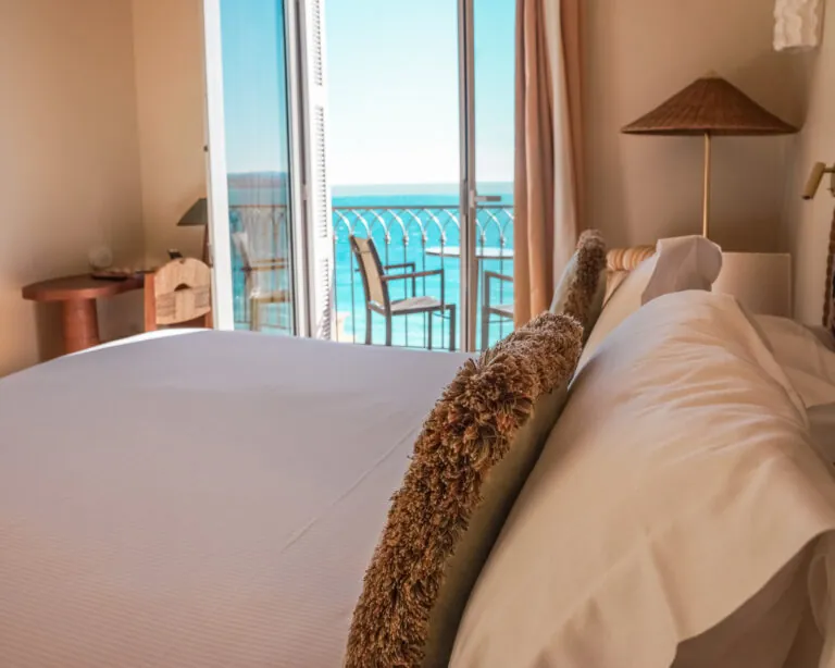 Grand windows open onto a balcony displaying an azure expanse that is the Mediterranean. In this place where the sea is ever present, you are at peace as you contemplate the seaside tableau and the horizon. It is also an incomparable spot for a leisurely breakfast.